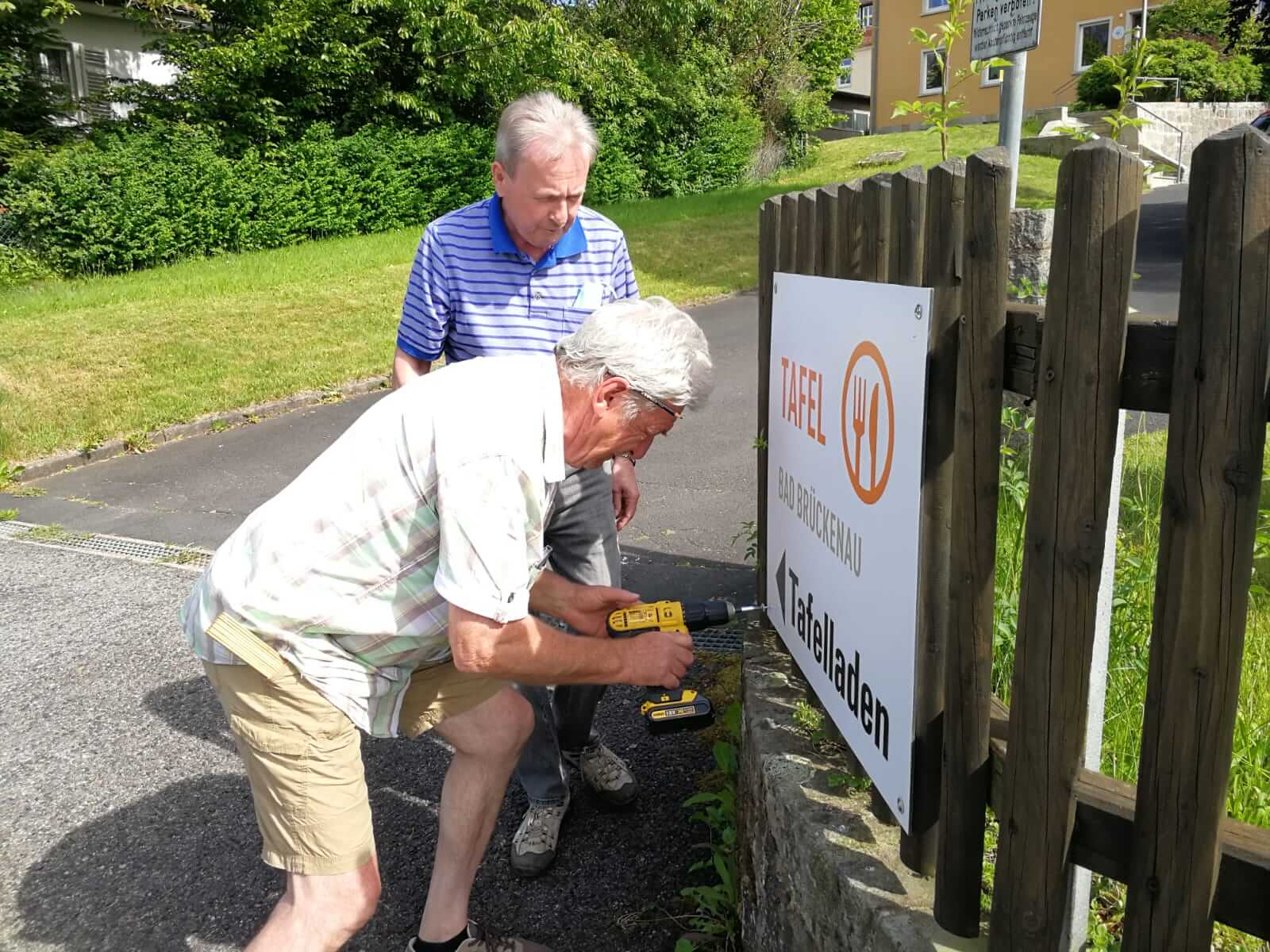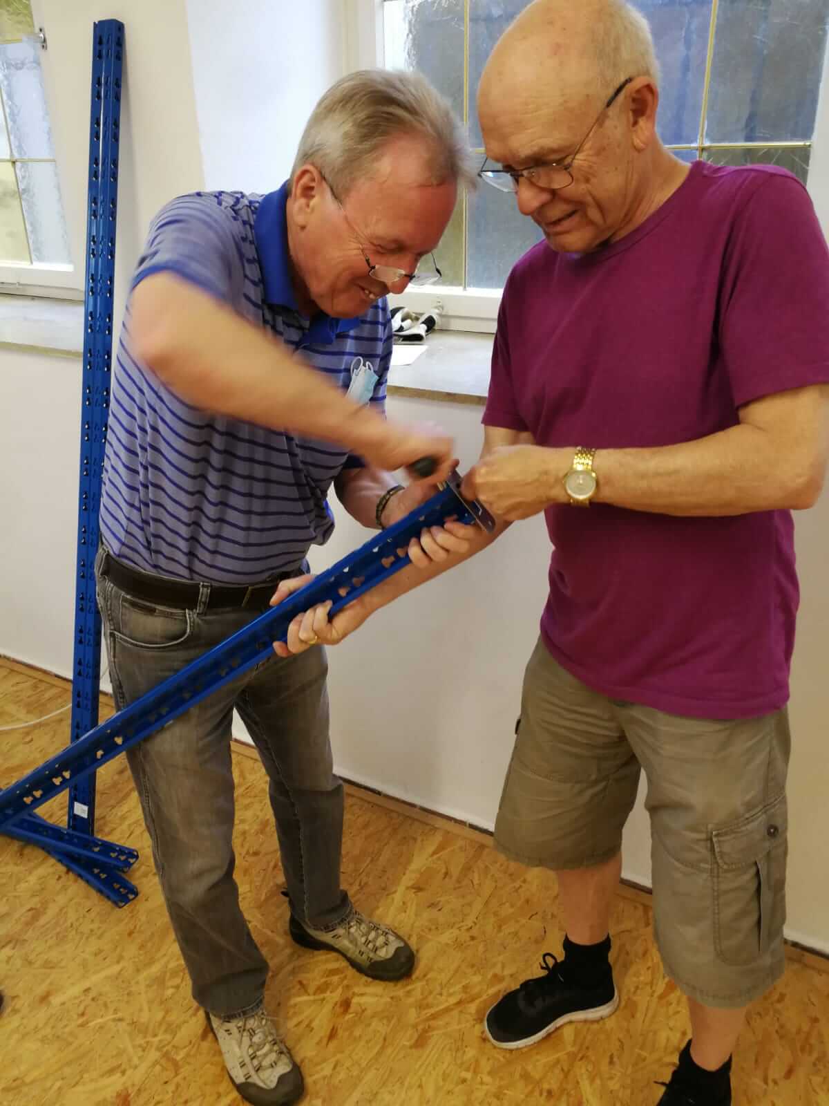 Dies alles hielt die beiden „Krisenmanager“ Hartmann und Schelle und dutzende Unterstützer mit hunderten freiwilligen helfenden (rechten, darunter freilich auch einigen „linken“) Händen in den letzten Mai-Wochen jedoch nicht davon ab, die Mammut-Aufgabe „Großumzug“ in Angriff zu nehmen. Da wurden in Tag- und Nacht-, früher Morgen- und später Abendarbeit Böden verlegt, Wände geweißelt, Elektroleitungen angeschlossen, Rohre gereinigt, Bleche geschweißt, Löcher gebohrt, Bohlen gesägt, Kanten geschliffen, Pinnwände angeschraubt, Türen im Tafel-Label orange gestrichen, Bretter lackiert, unzählige Tische, Schränke und Regale abmontiert und wieder aufgebaut. Toujours hallten mehr oder weniger „eindeutige Ansagen“, Kommandos und „versteckte“ Komplimente an die „Handlanger“ und „fleißigen Bienchen“ durch die alten und neuen heiligen Tafel-Hallen: „Hans-Jürgen, hältst Du bitte mal die Strebe“. „Hans-Peter, ich wollte einen Schraubenzieher, keinen Schraubenschlüssel“. „Jutta, Heidi, Josi und Irmi: ein Riesenlob. So schön waren die Fenster noch nie geputzt“. „Hermann, holst Du mal einen 10er Bohrer?“ „Heinz, kannst Du bitte vom Bauhof einen Gabelstapler für das Umladen der ausrangierten Kühltruhe organisieren? Und Karl und Bobby – ihr fahrt die dann morgen mit dem Sprinter nach Wirmsthal zur Sondermüll-Deponie, oder?“ „Max und Kim, nehmt doch die Rollwägen zum Transport der schweren Regale, da plagt ihr euch nicht so.“ „Klaus und Rolf – ihr Zwei seid zu allem zu gebrauchen, euch kann man überall hinstellen.“ „Nico, dein selbst entworfenes Werbeplakat für die Tafel ist spitze, über dem Haupteingang bestens platziert und akkurat montiert.“ „Traudel und Martina haben sich schwer ins Zeug gelegt und die alten Räumlichkeiten besenrein übergeben. So leergefegt ohne Menschen und Material sieht das schon irgendwie komisch aus.“ „Wenn wir Brigitte, Nina und Anja nicht hätten, dann könnten wir gleich einpacken.“ Und, und, und…